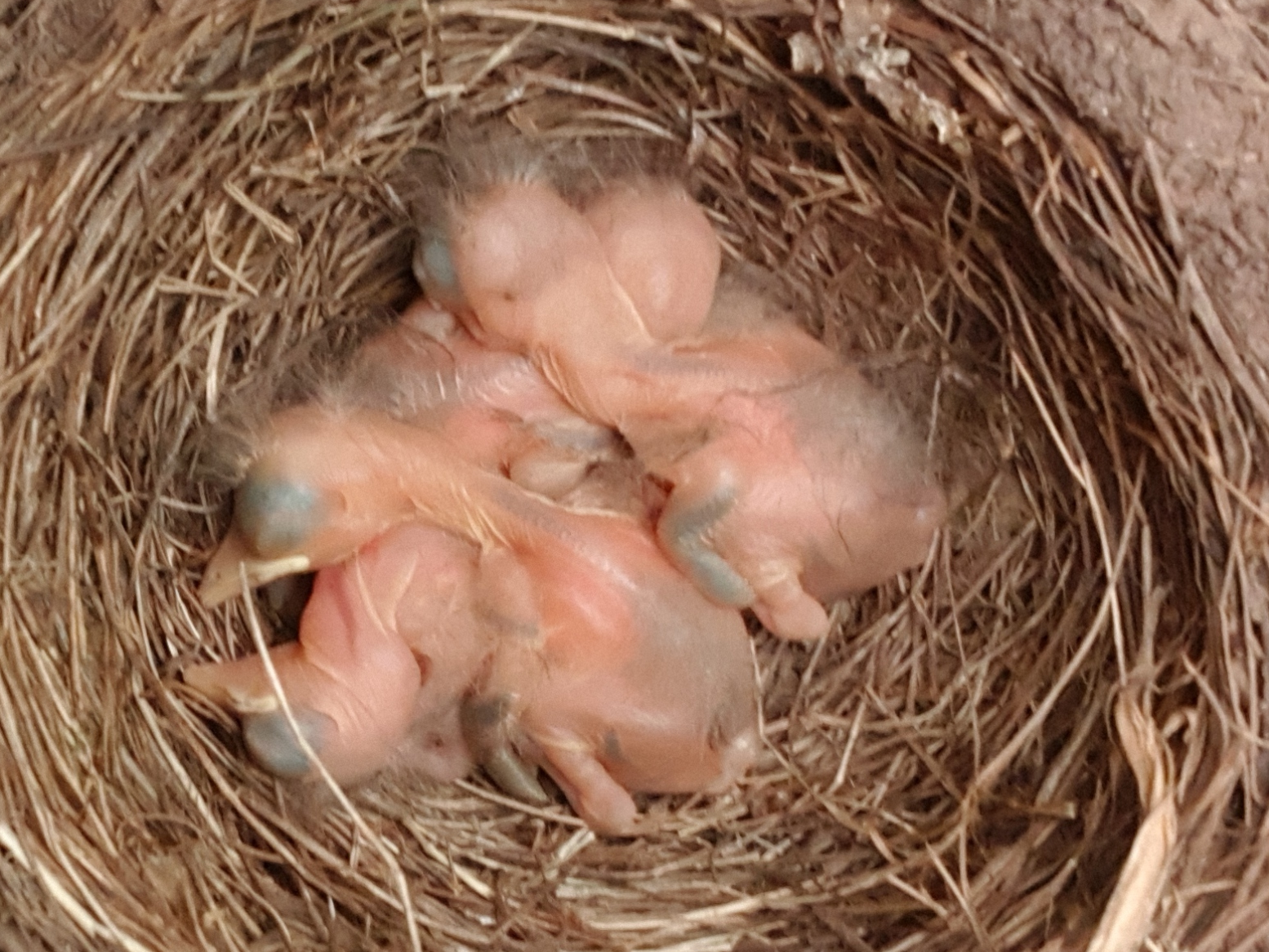 Nachdem das erste Küken geschlüpft war und die Amsel die Eierschale entsorgte, hat sie im Verlauf von vier Stunden weitere Eierschalenreste fortgetragen. Also muss irgendwann am Nachmittag das zweite Küken geschlüpft sein.