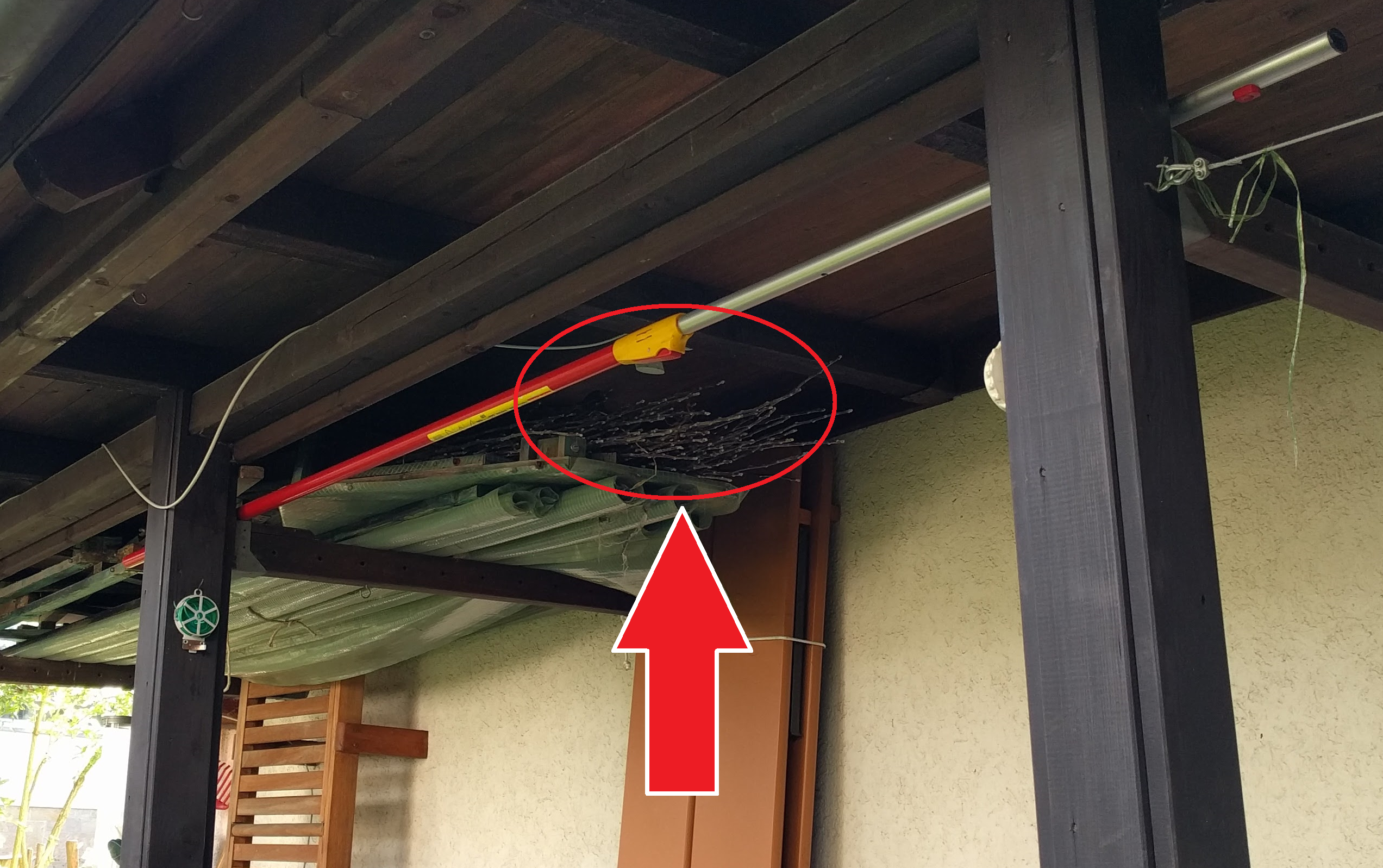 Das Foto stammt von letztem Jahr. Es hat sich seither kaum etwas geändert. Der Standort befindet sich unter einem pergolaartigem Anbau an der Stirnseite unseres Hauses. Die Querbalken unter der Decke nutzen wir zur Lagerung verschiedener Sachen.