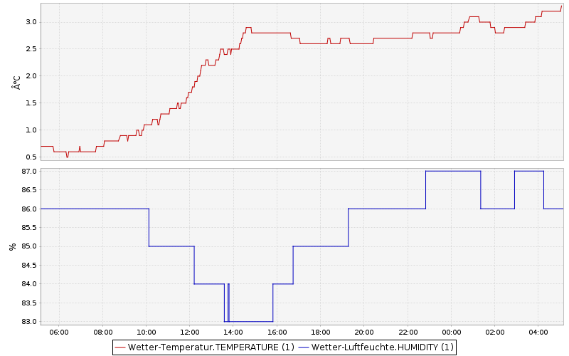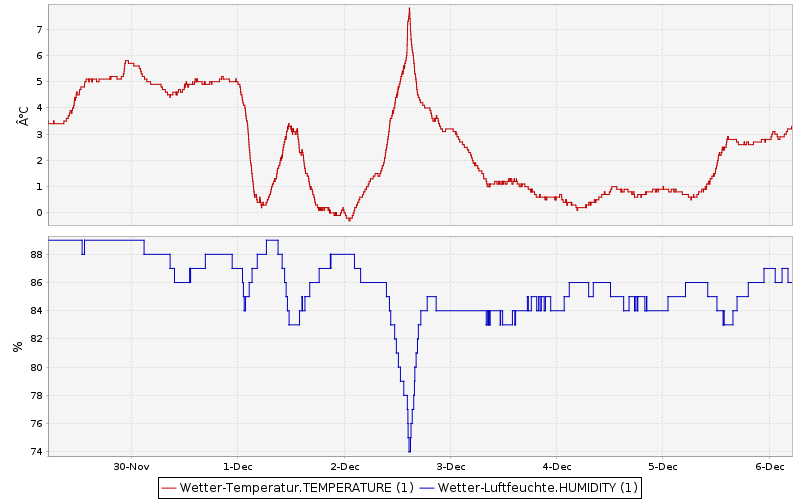Messgröße Letzter Messwert aktualisiert Datum/Zeit Temperatur 3.1 °C 06.12.2025 04:08:00 rel. Luftfeuchte 86 % 06.12.2025 04:15:04 Luftdruck ü. NN 1011.5 hPa 06.12.2025 04:26:54 Niederschlag Heute 0.0 l/m² 06.12.2025 00:00:32 Webseite und Diagramme 06.12.2025 04:29:04